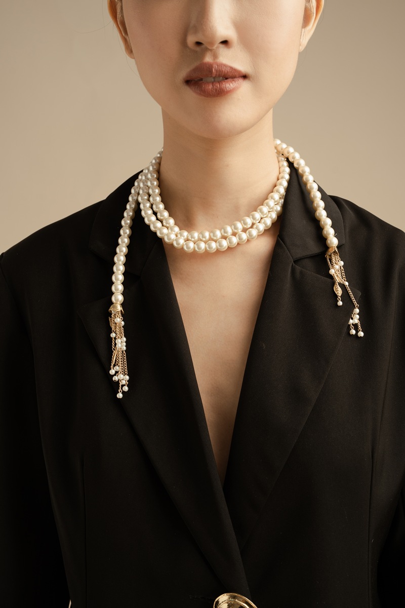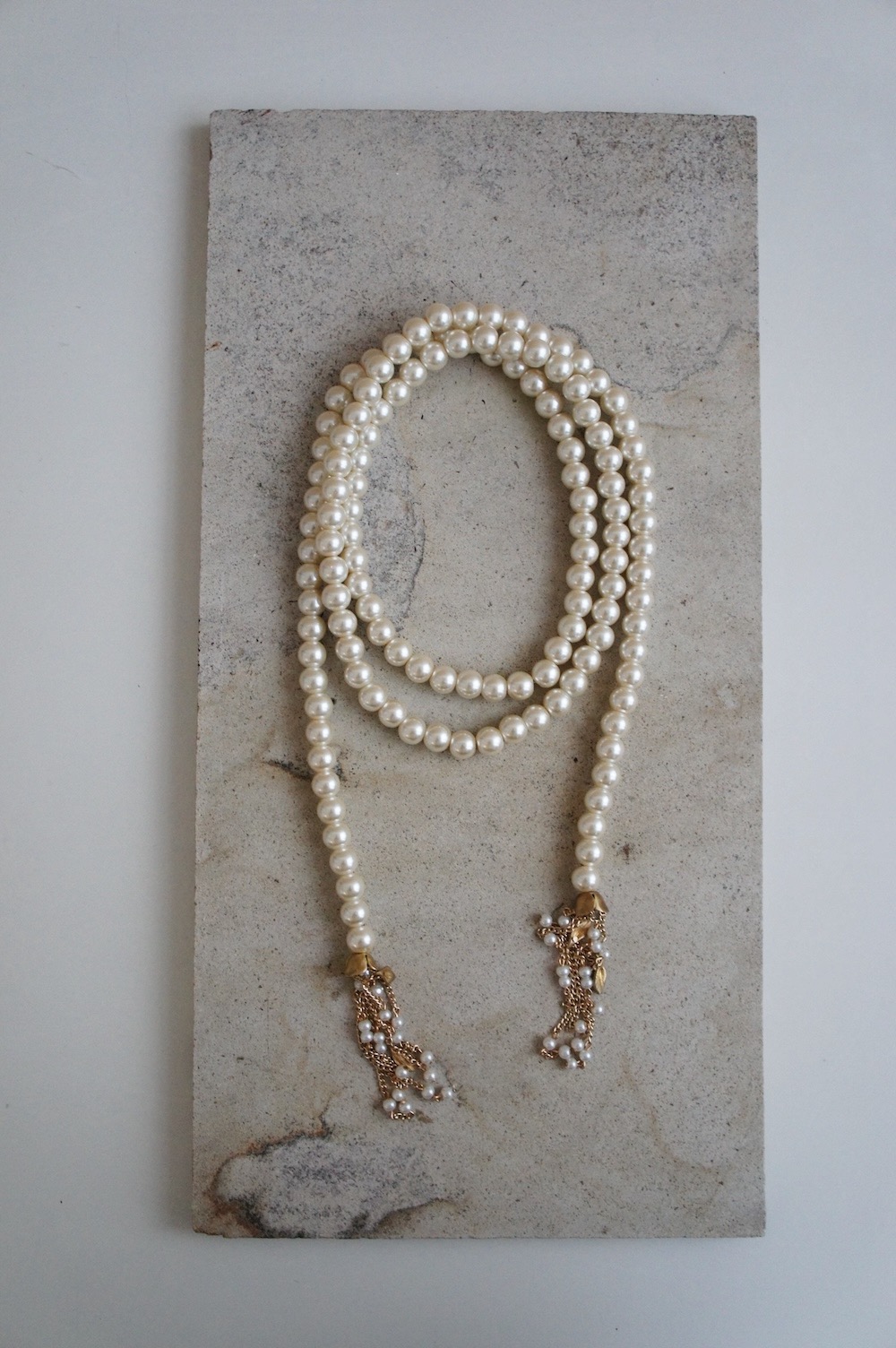 A layer of synthetic pearls necklace finished with tassel style ornaments at both end, made of synthetic pearls attached to layers of small gold plated chain and gold brass plates.