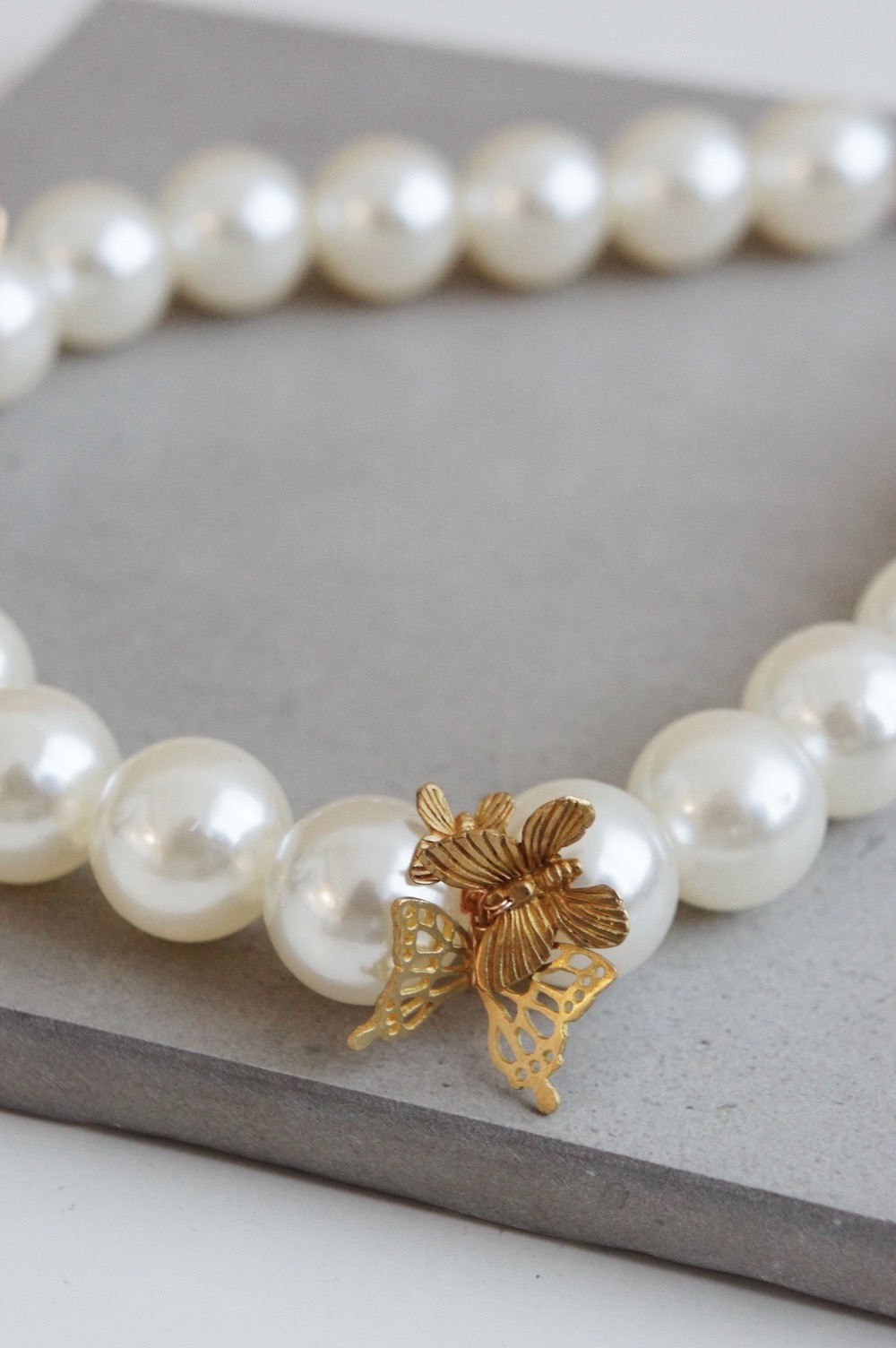A layer of 18mm synthetic pearl necklace with various kind of butterfly shaped brass plates coated in gold color attached to the necklace.