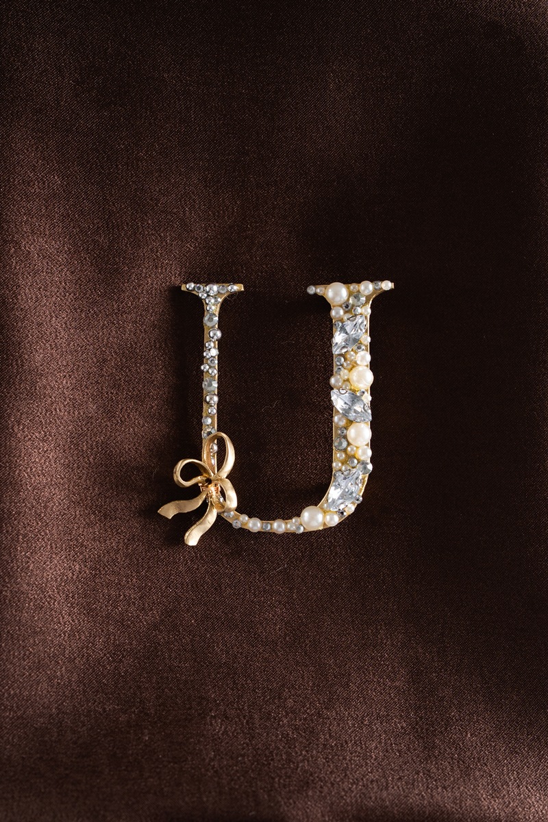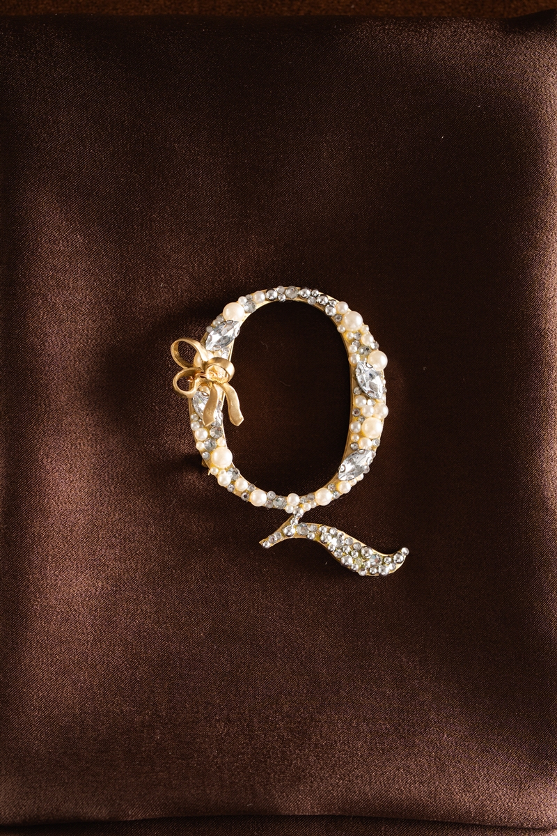 Alphabet- shaped brooch made from brass plates coated in gold color. Decorated with beads, synthetic pearls, synthetic crystals, and finished with a bow-shaped plate on top.
