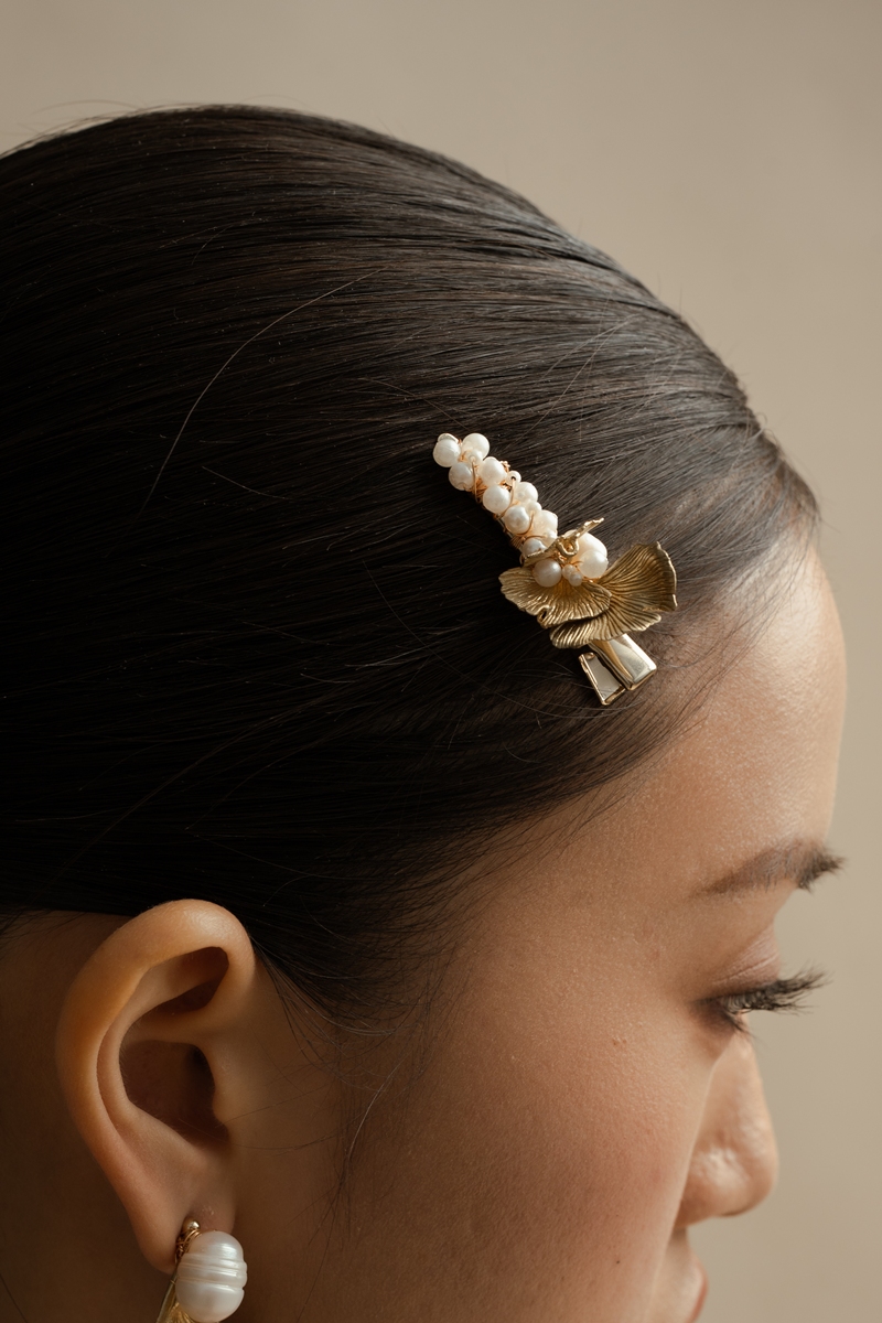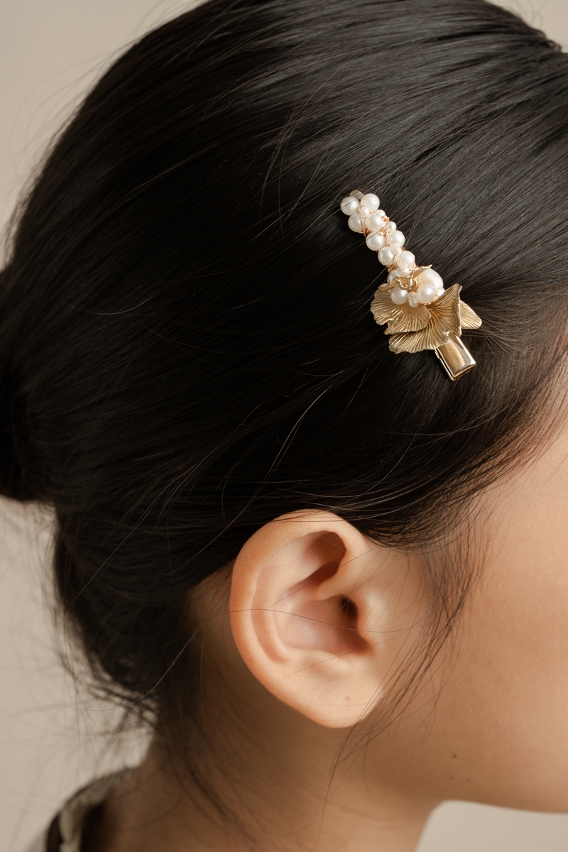 A small alligator hair clip covered with white synthetic pearls, with touch of leaf shaped brass plates coated in gold color.