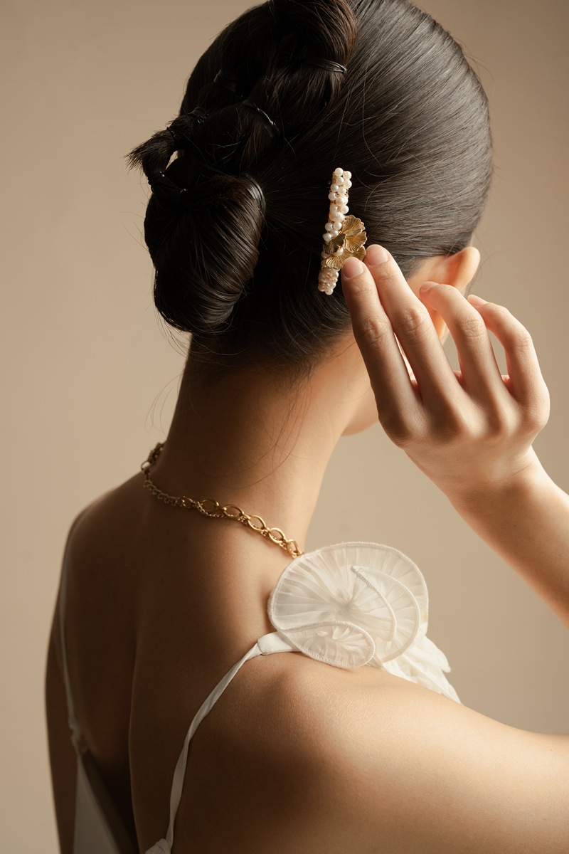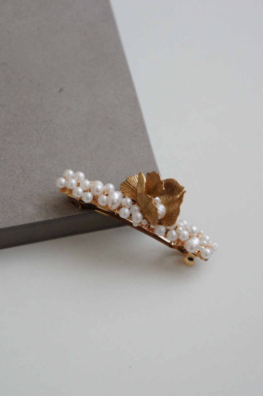 A small valleta hair clip covered with white synthetic pearls, with touch of leaf shaped brass plates coated in gold color.