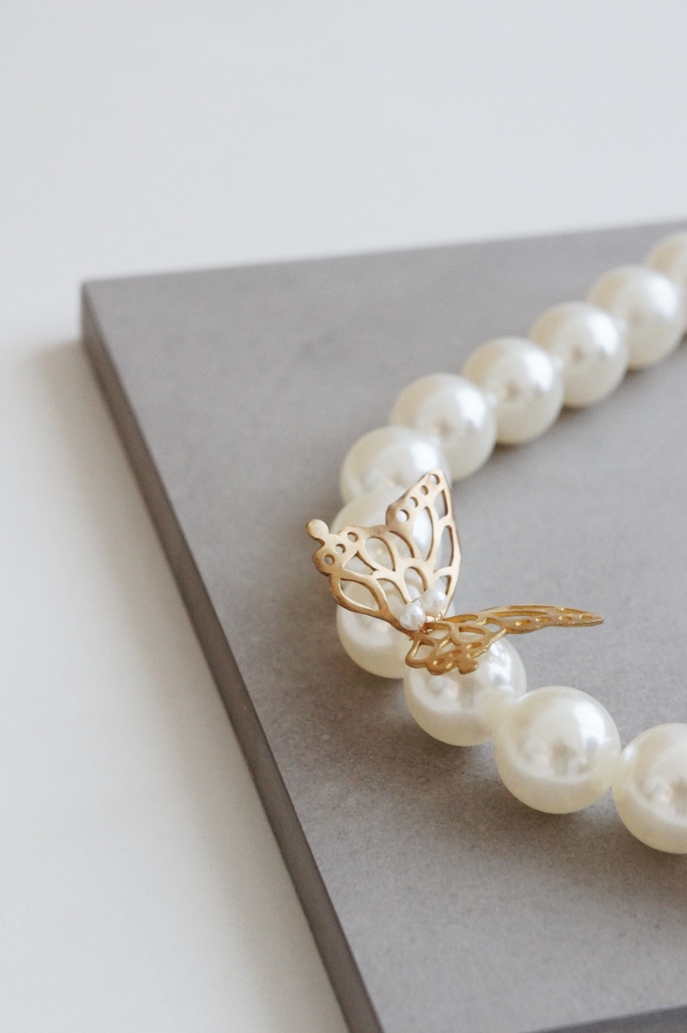 A layer of 18mm synthetic pearl necklace with various kind of butterfly shaped brass plates coated in gold color attached to the necklace.