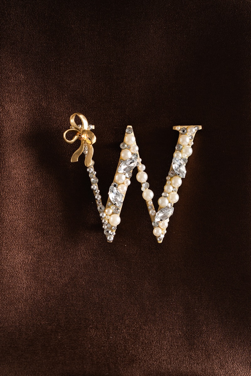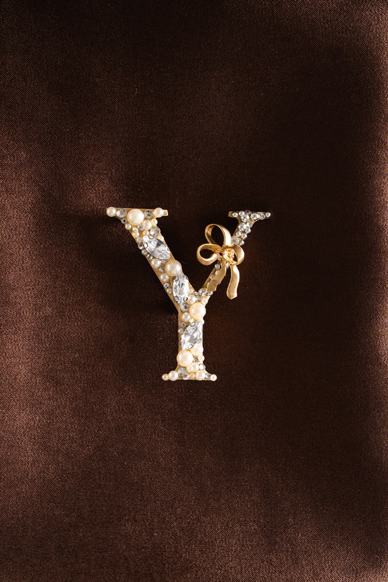 Alphabet- shaped brooch made from brass plates coated in gold color. Decorated with beads, synthetic pearls, synthetic crystals, and finished with a bow-shaped plate on top.