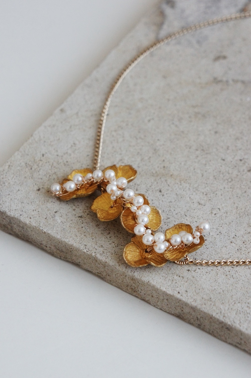 A layer of gold plated brass chain with synthetic pearls and flower shaped brass coated in gold color as the ornaments.