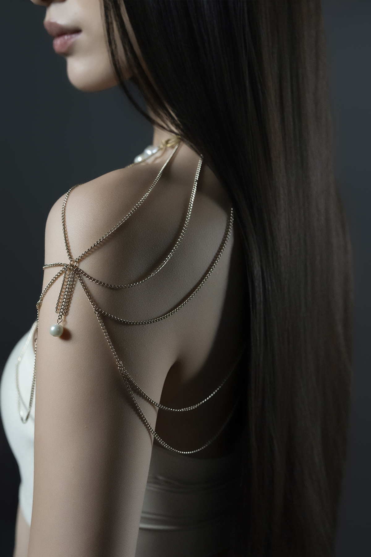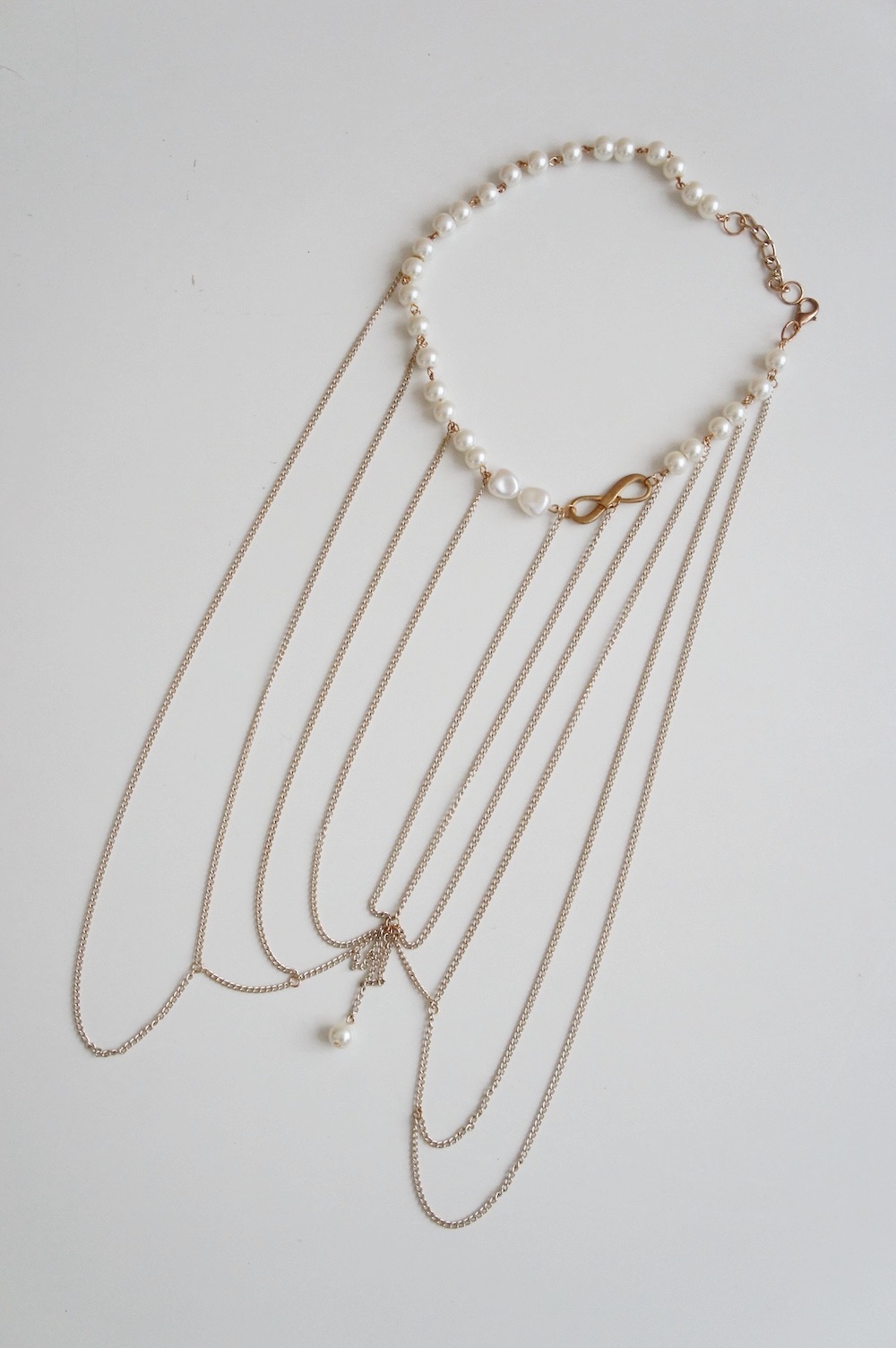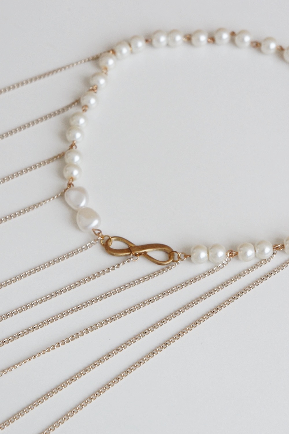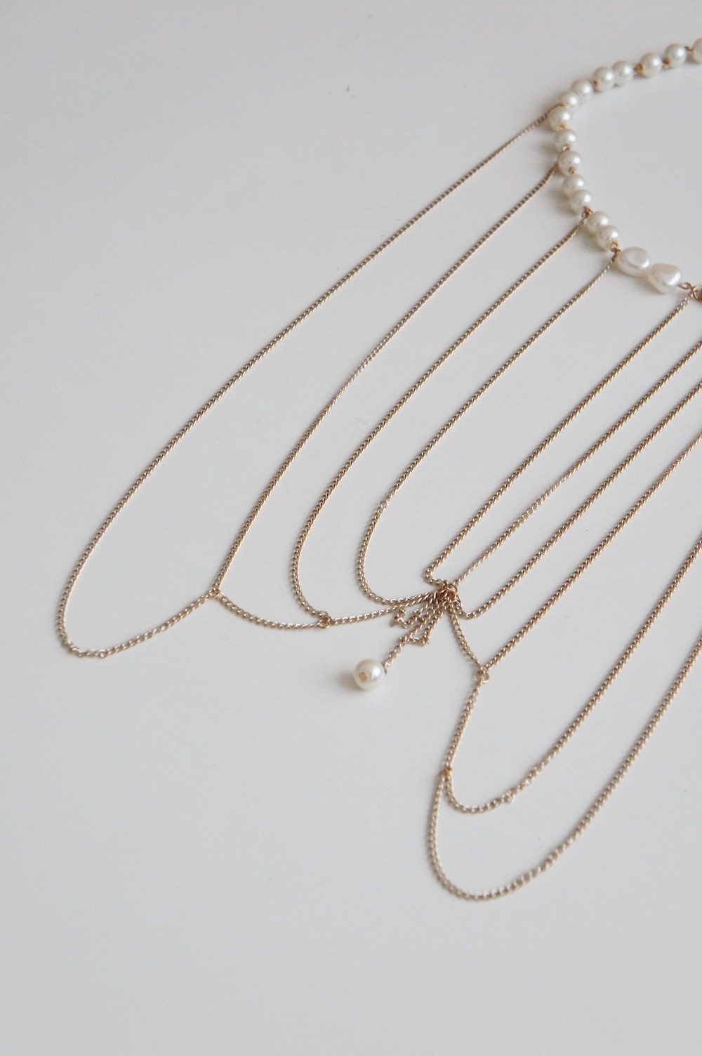 A layer of synthetic pearl with layers of gold plated brass chain and gold brass plate.