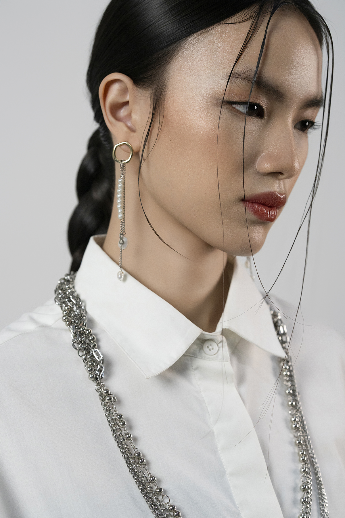 Long earrings made of synthetic and fresh-water pearls, silver brass chain and white brass plates.