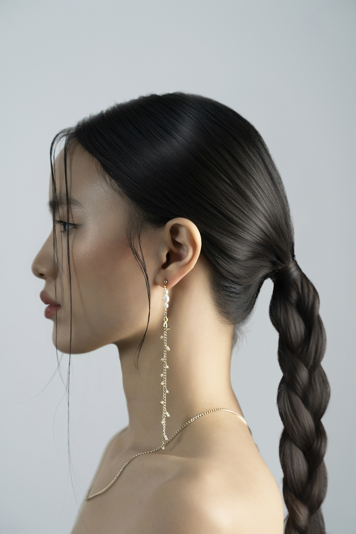 Long earrings made of synthetic pearls, gold brass chain and gold brass plates.