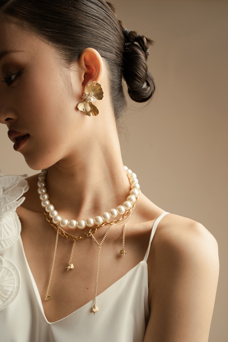 A layer of synthetic pearls and a layer of stainless gold chain necklace with ornaments made of leaf shaped gold brass plates attached to 14k gold plated chains.