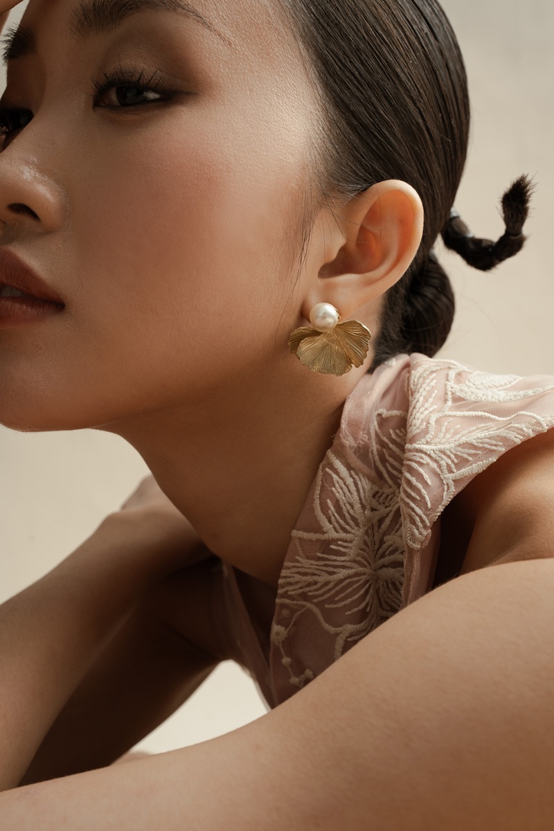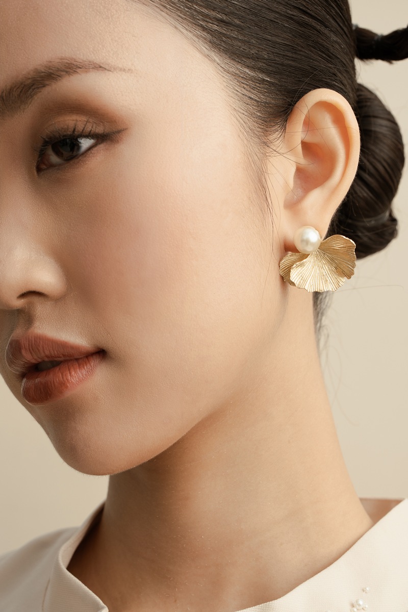 Earrings made of leaf shaped brass plates coated in gold color and synthetic pearls.