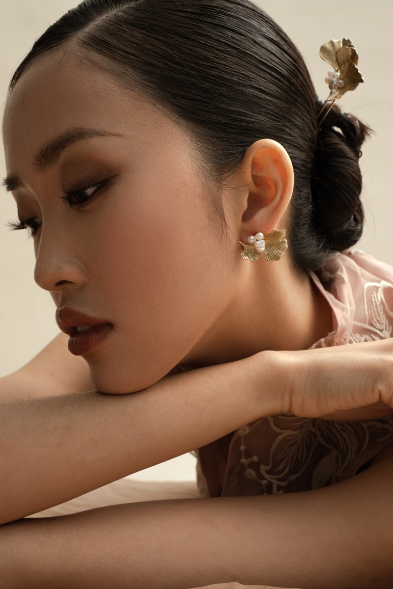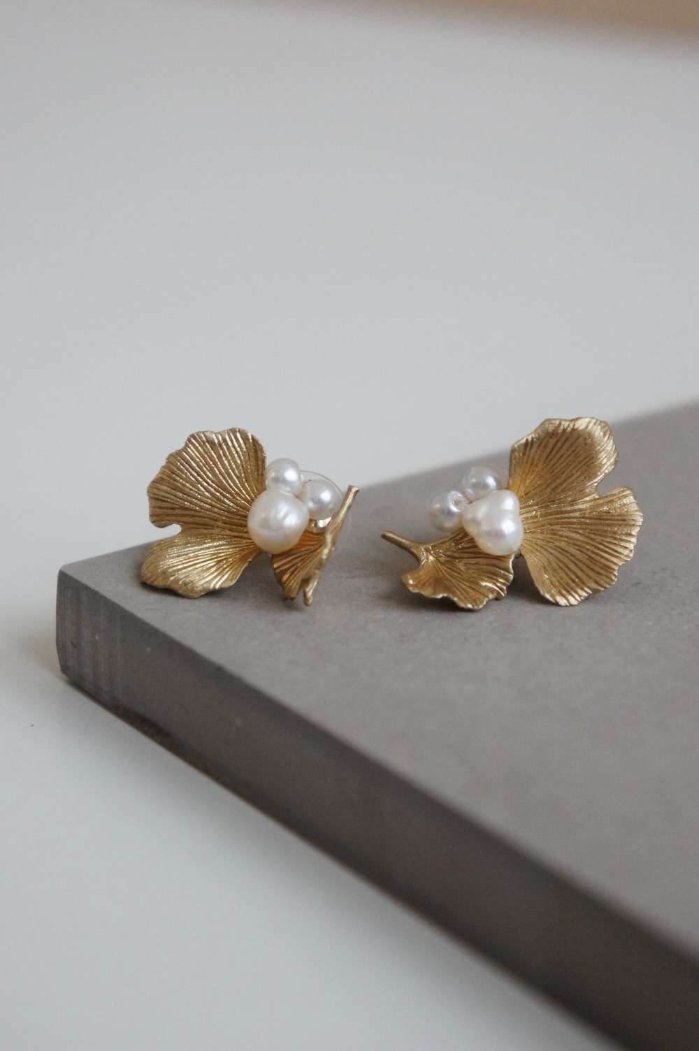 Earrings made of leaf shaped brass plates coated in gold color and synthetic pearls.