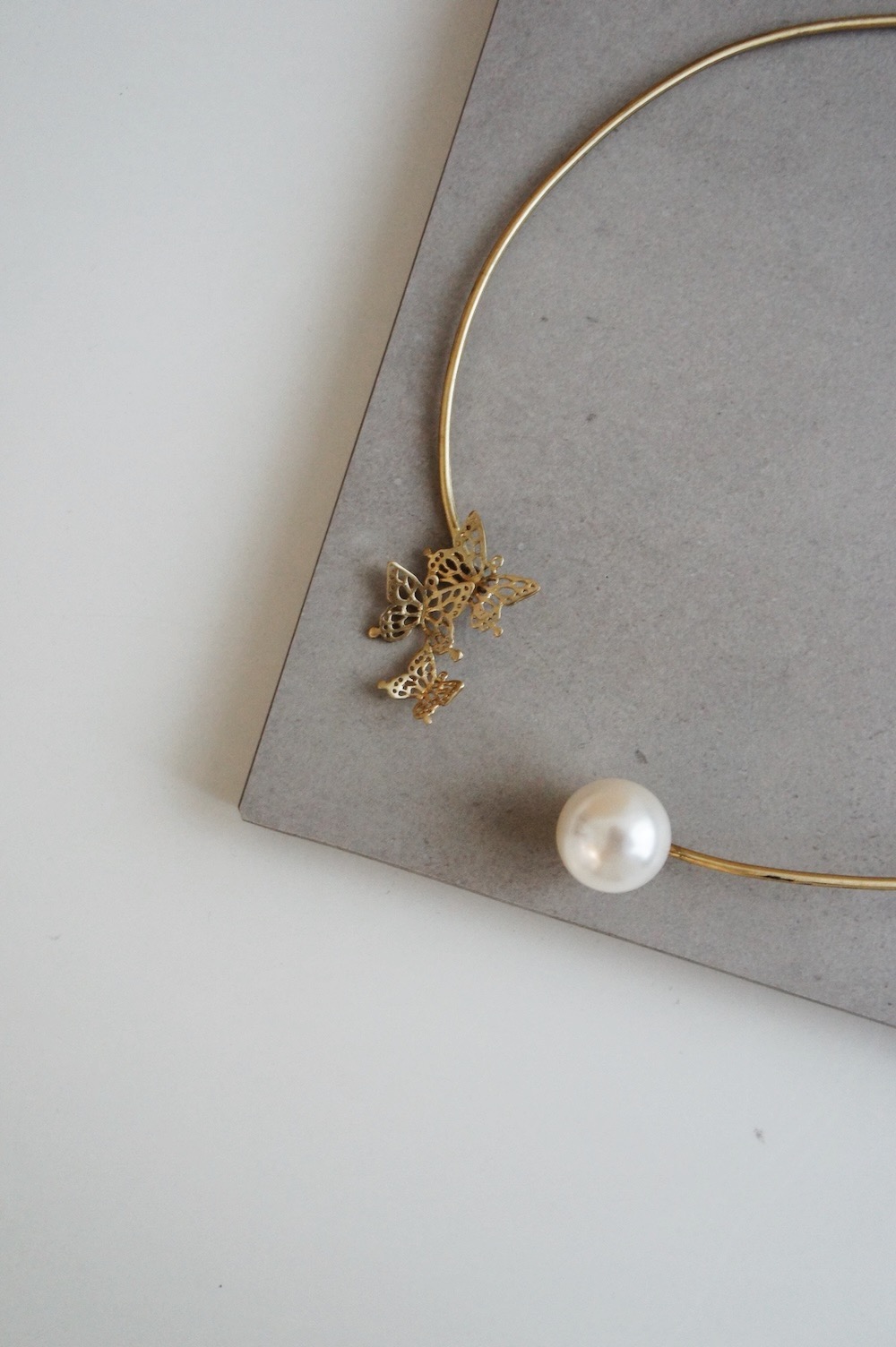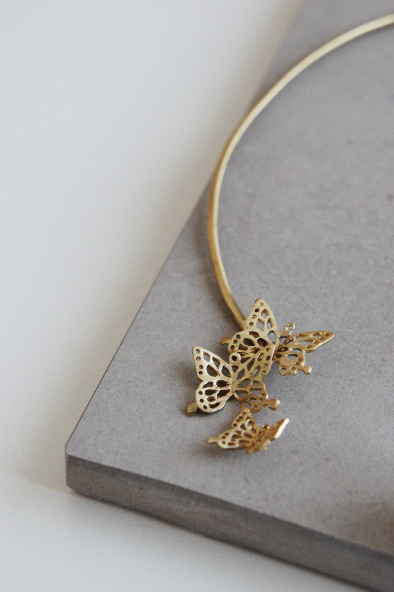 A brass plates choker coated in gold color with synthetic pearl on one end and butterflies shaped brass plates at the other.